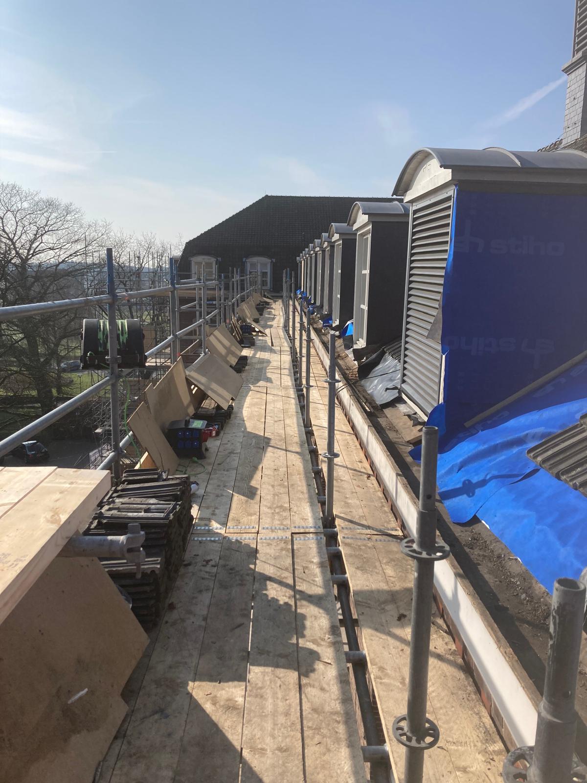 Inmiddels omsluiten staal en steigerplanken het monumentale Missiehuis. Over ruim honderd meter lengte en dertien meter hoogte werken restauratietimmerman Toine en zijn collega’s aan het herstel van goten, dak en dakkapellen. Opnieuw een belangrijke fase voor MissieThuis en de werkzaamheden rondom instandhouding van het monumentale pand. Toine, al twintig jaar verbonden aan Nico de Bont | TBI, ziet het restauratievak veranderen. “Het draait steeds meer om herbestemmen, maar de historische waarde blijft belangrijk,” zegt hij.